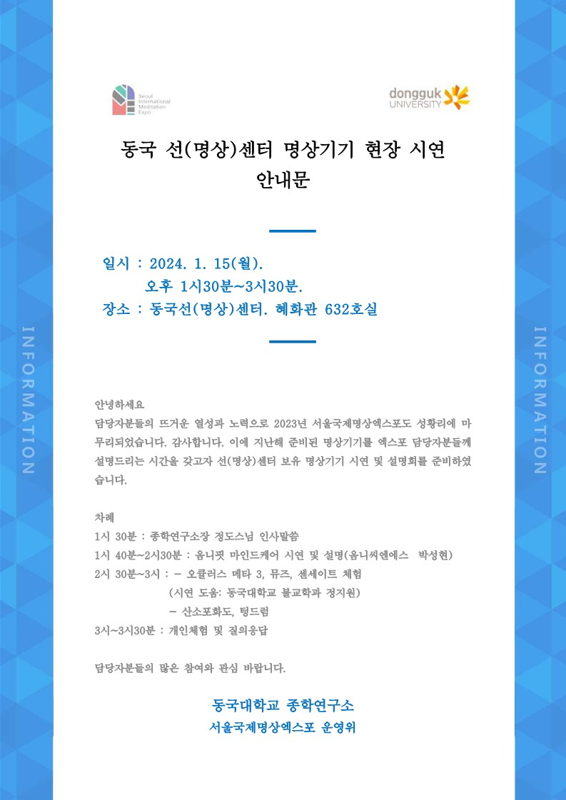 동국 선(명상)센터 명상기기 현장 시연(2024.1.15) 안내문