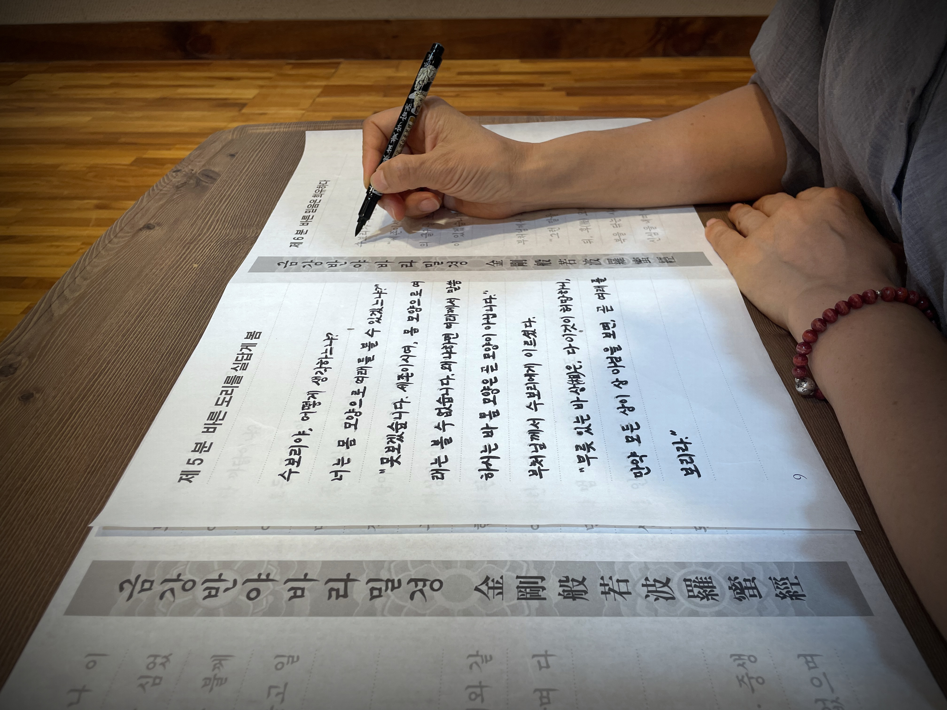 현대인의 분산된 의식과 불안을 치유하는 금강경 사경 명상은, 마음을 다스리고 본래의 평안을 회복하게 하는 수행법입니다. 한 자 한 자 정성껏 써 내려가는 과정에서 심신이 안정되고, 집중력과 내면의 고요함이 자연스럽게 깨어납니다.