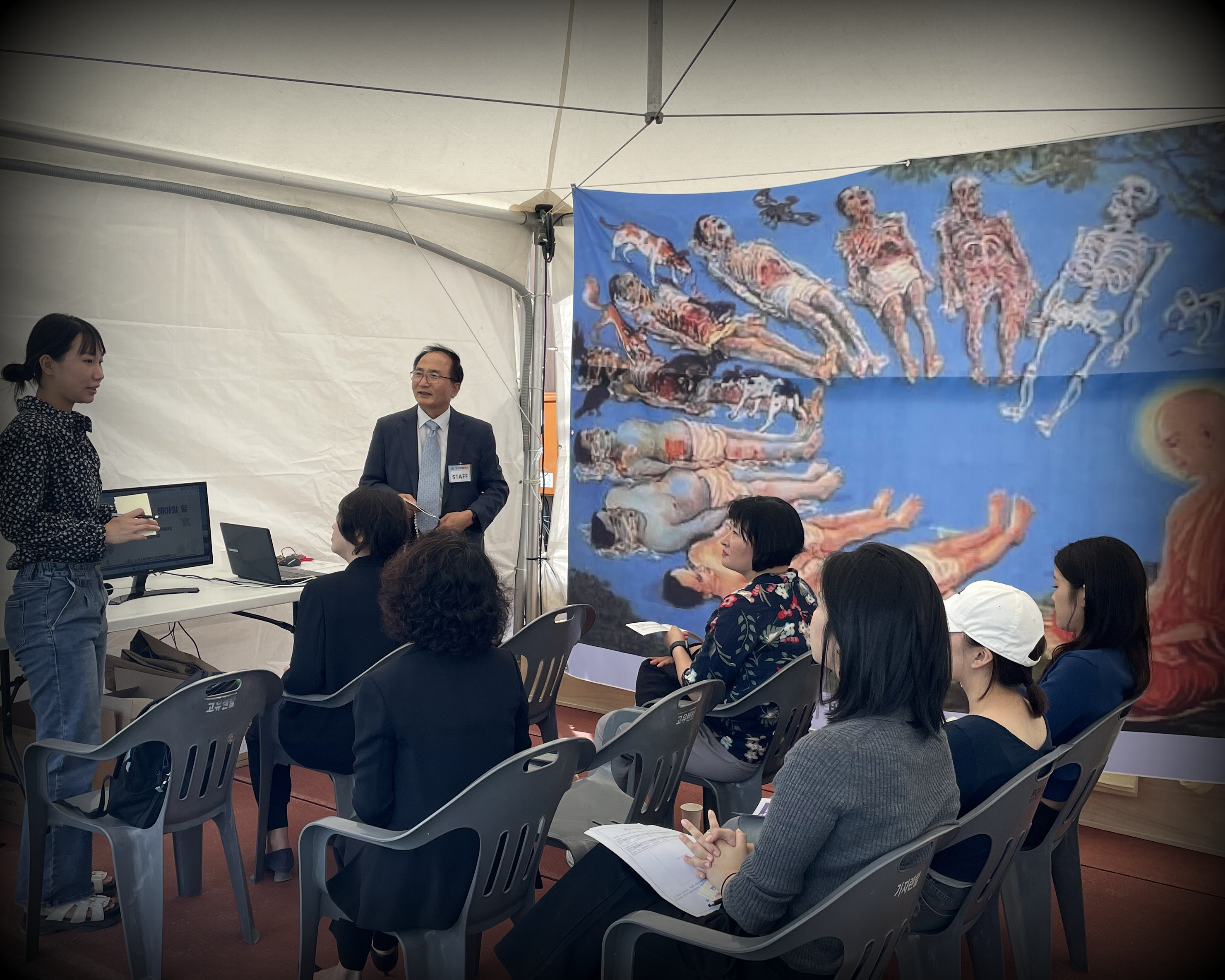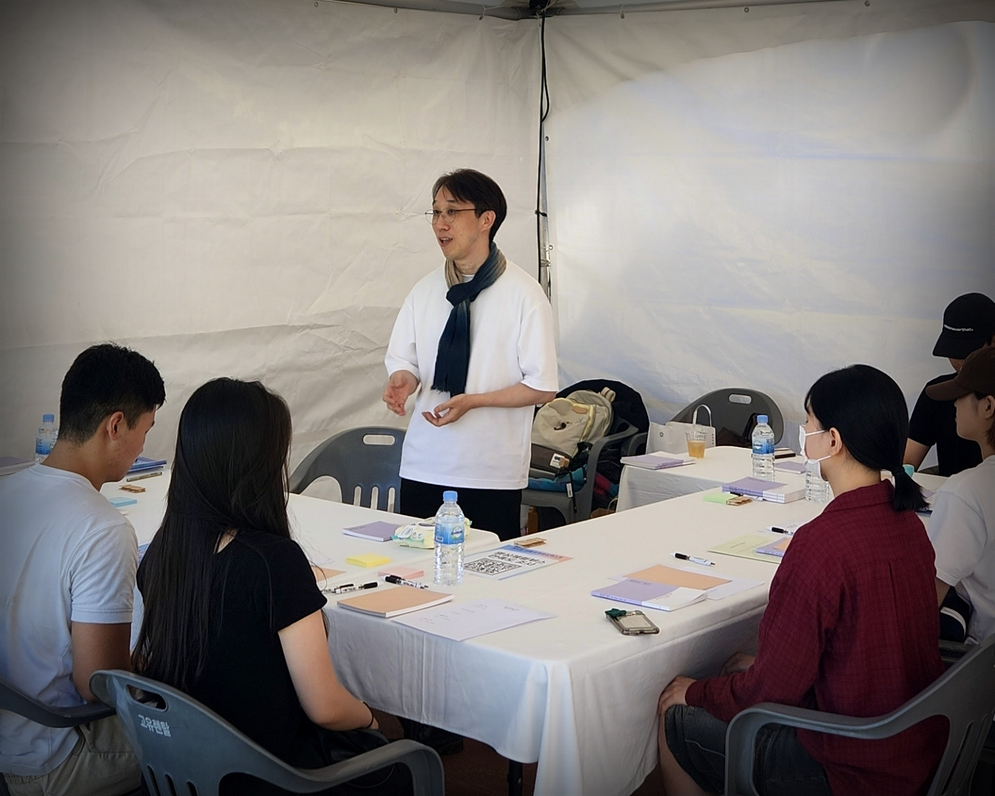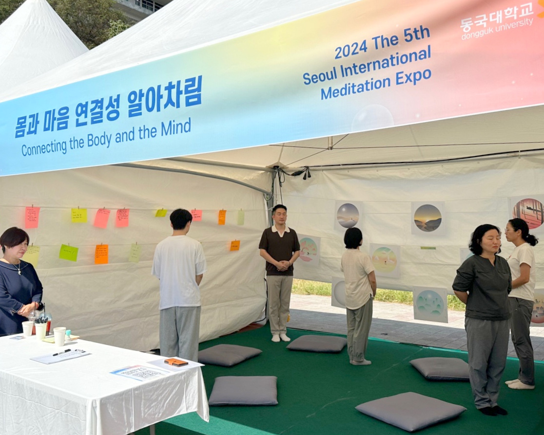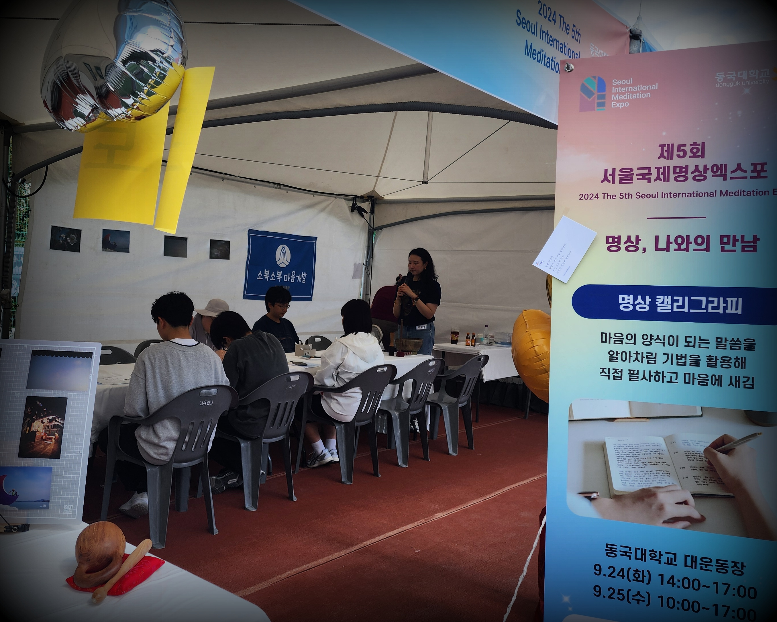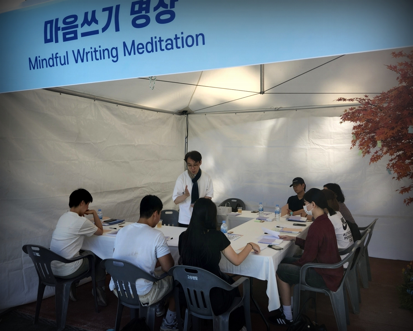 차와 쉼을 통해 존재의 머무름’과 ‘공동 만다라’라는 연기적 연결을 중심에 둔 명상 체험 공간입니다. 체험 부스를 찾은 참여자들이 차 한 잔의 여유 속에서 자신을 돌아보고, 감정을 쉬게 하며, 짧은 질문과 연꽃 스티커 활동을 통해 일상에서 명상이 어떻게 실천될 수 있는지를 자연스럽게 체험하도록 구성되어 있습니다.
