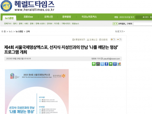 [헤럴드타임즈] 제4회 서울국제명상엑스포, 선지식·지성인과의 만남 ‘나를 깨닫는 명상’ 프로그램 개최