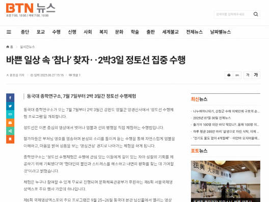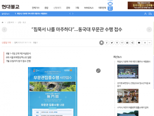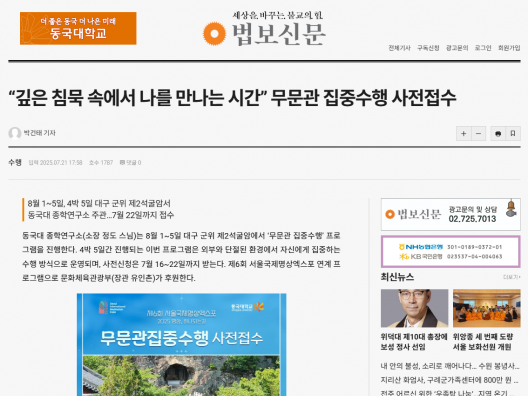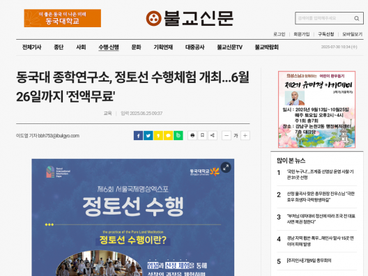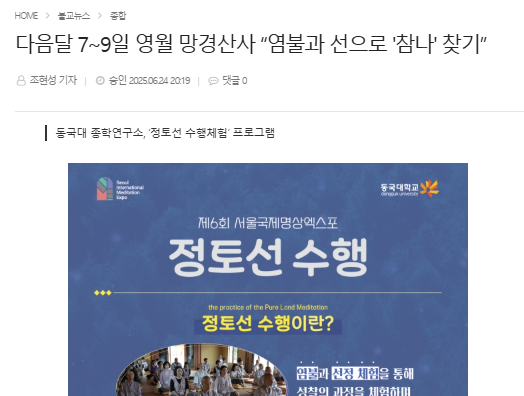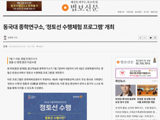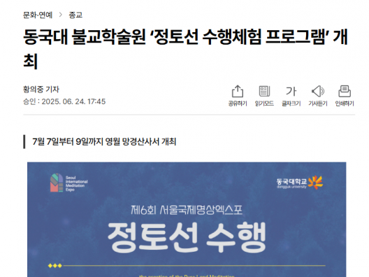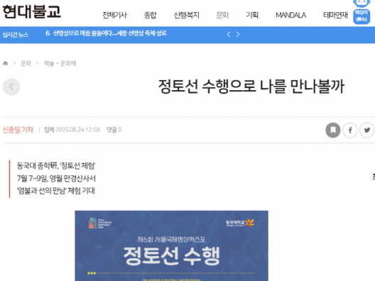 [불교신문] 동국대 종학연구소, 정토선 수행체험 개최...6월26일까지 '전액무료'