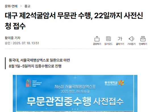 [아시아투데이] 대구 제2석굴암서 무문관 수행, 22일까지 사전신청 접수